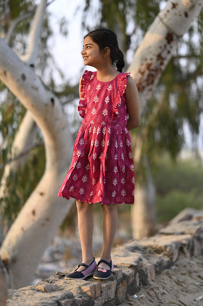 Roja Pink floral dress for girls, featuring a vibrant digitally printed Indian floral design—perfect for festive occasions or everyday charm.